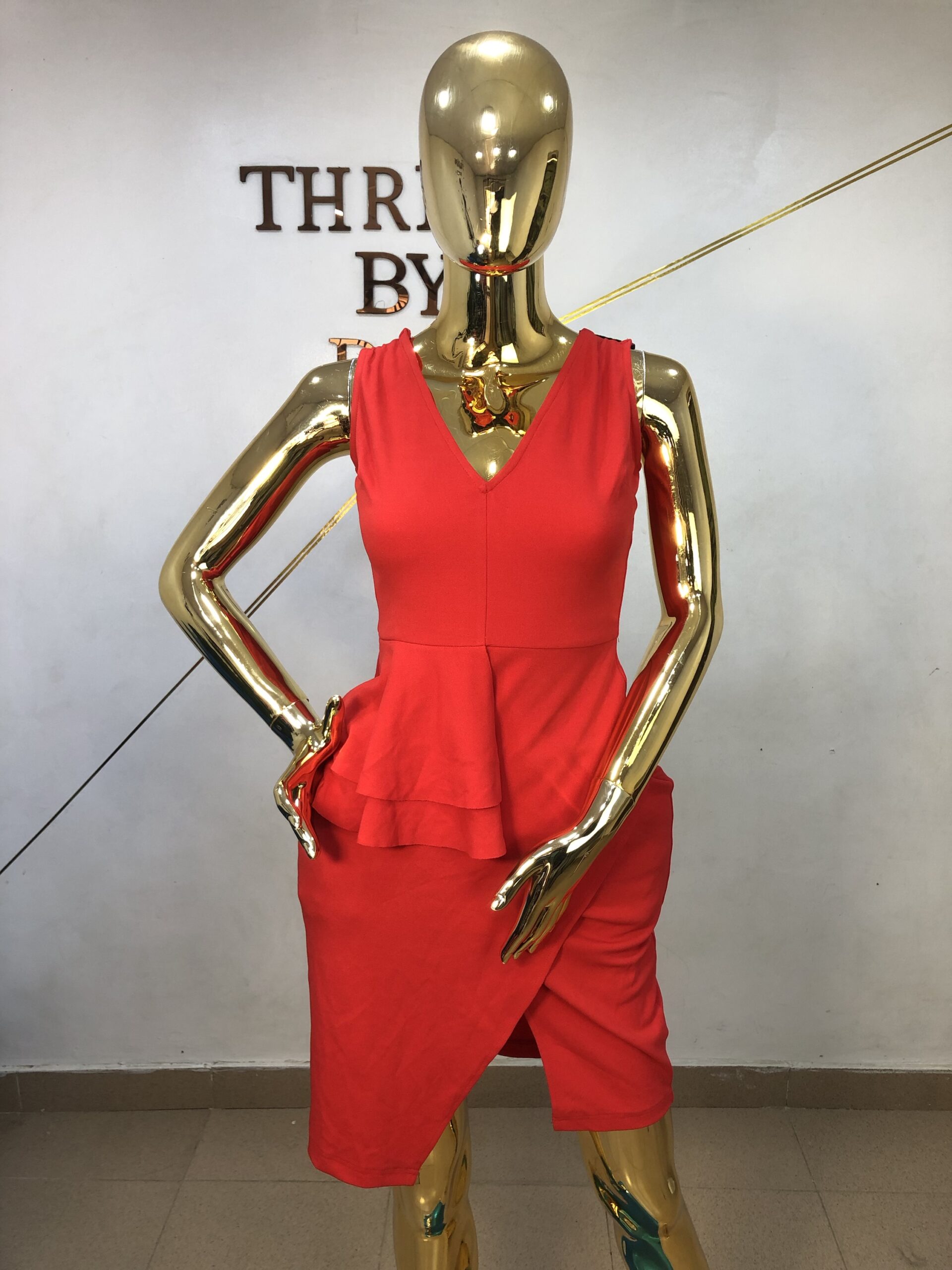 Sleeveless red gown with V- neckline!